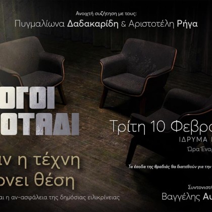 Ο Πυγμαλίων Δαδακαρίδης και ο Αριστοτέλης Ρήγας συνομιλούν με τον Βαγγέλη Αυγουλά και το κοινό, σε έναν ανοιχτό διάλογο στο απόλυτο σκοτάδι. Την Τρίτη 10/2/2026 στις 21.00 στο Ίδρυμα Μιχάλης Κακογιάννης....